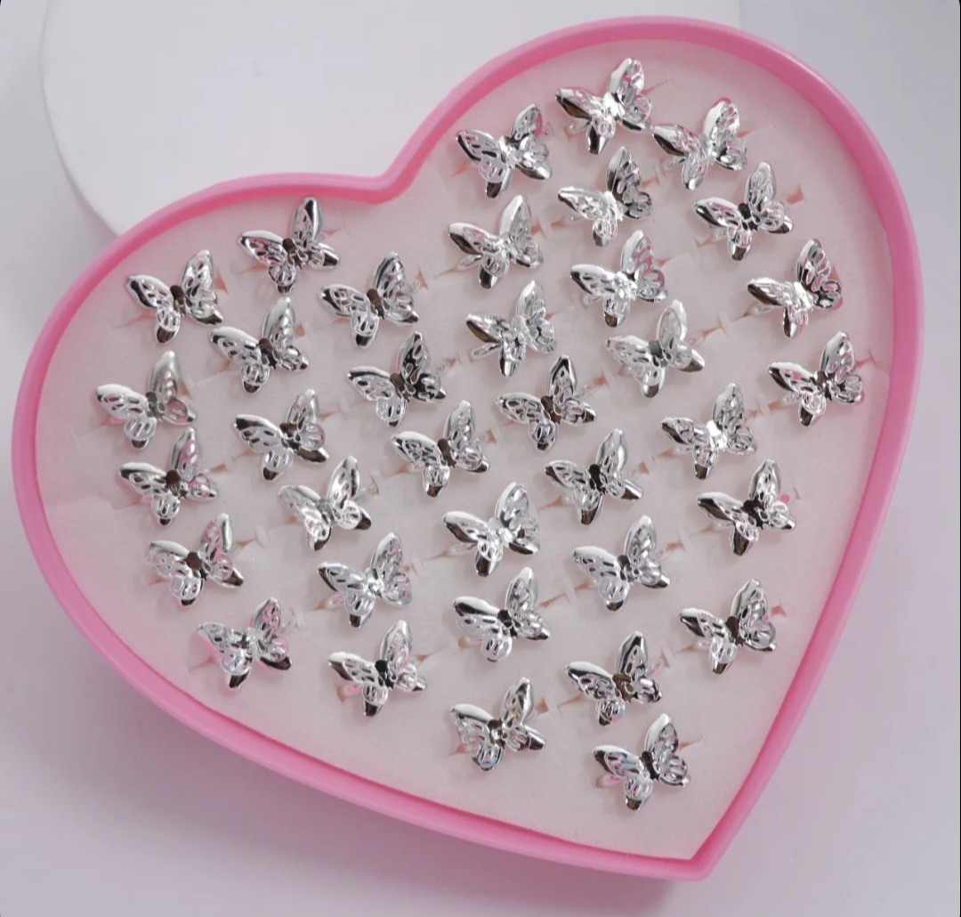 پک انگشتر دخترانه پروانه نقره ای 36 عددی فری سایز 75383